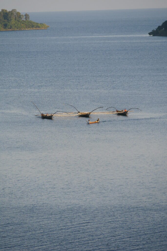 They leave at sunset on Lake Kivu, paddling without lights and singing lively songs that tease, joke, and praise loved ones. Each team uses three canoes — Ishaba for nets, Kati for lanterns, and Ijyiza for balance, with three fishermen in each canoe pulling the big nets together to catch fish.